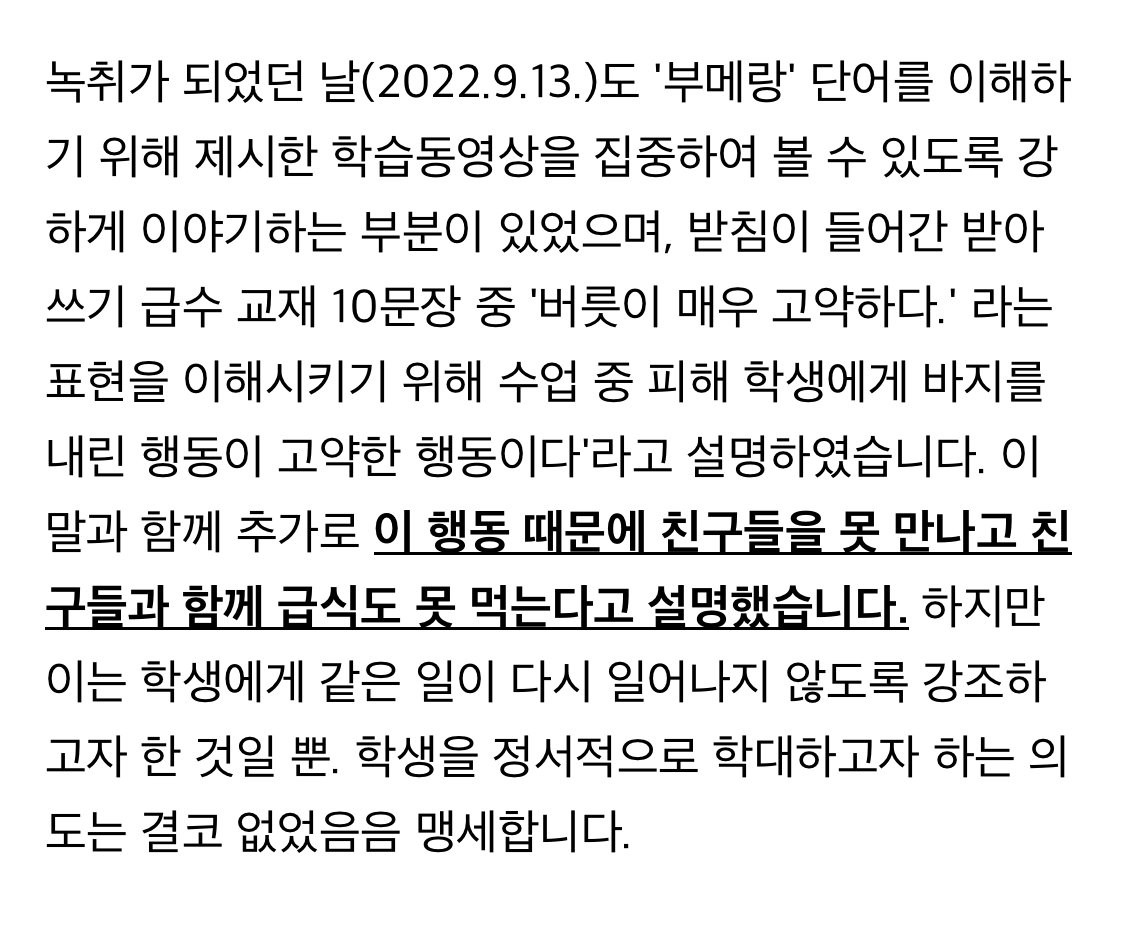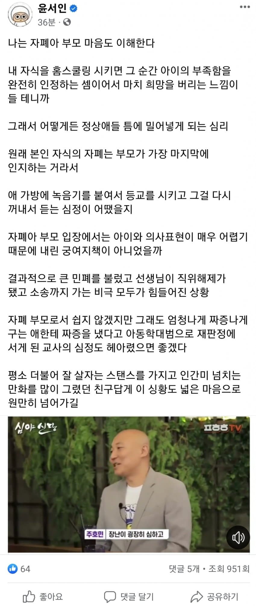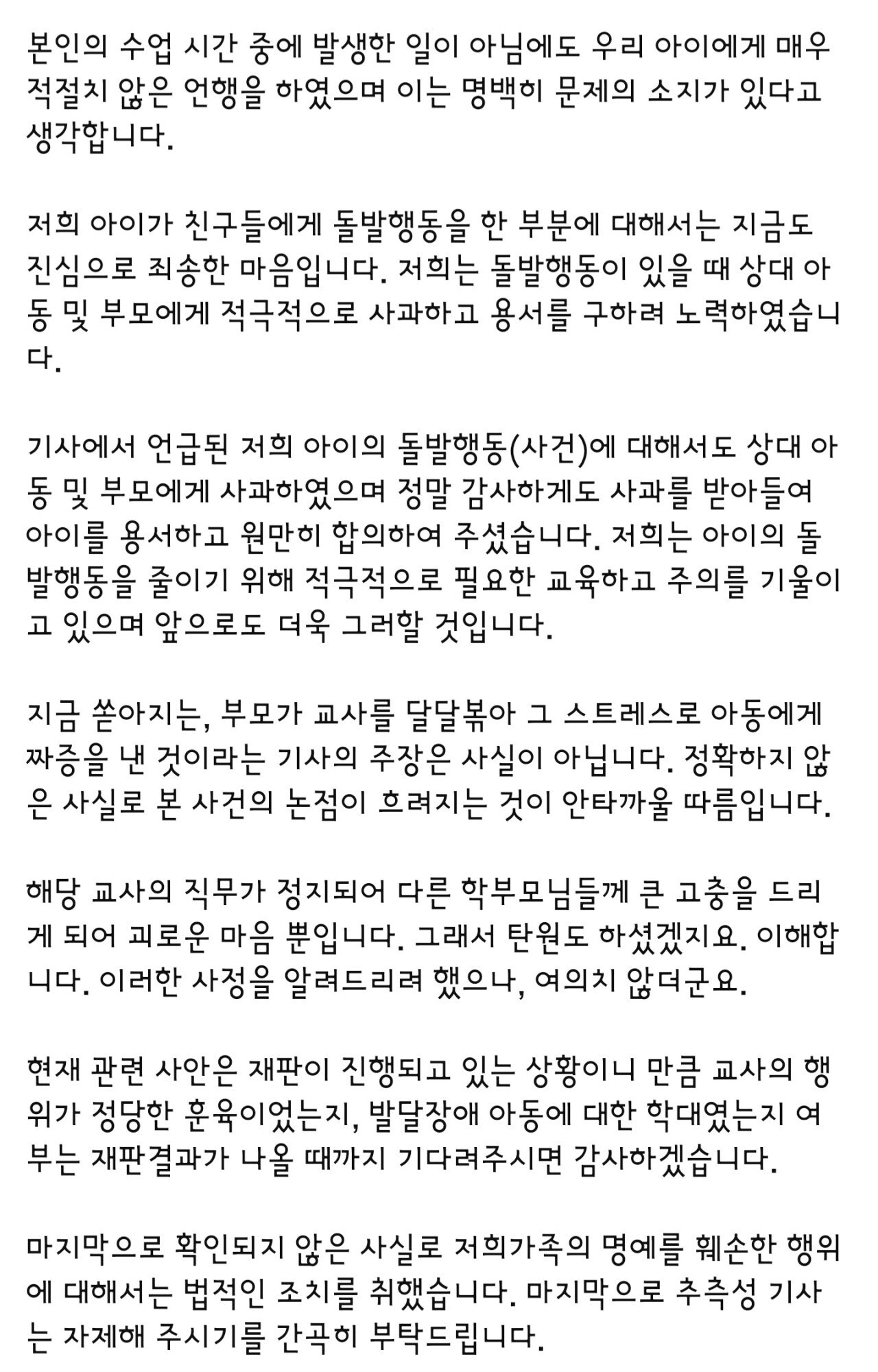작가는 아이가 당시 해당 교사의 수업에서 돌발행동을 한 것이 아니라 다른 일반교사의 수업 시간이었으며, 교사가 매우 적절치 않은 언행을 한 것이 문제라고 주장하였습니다. 현재 관련 사안은 재판이 진행 중이라고 덧붙였습니다.
