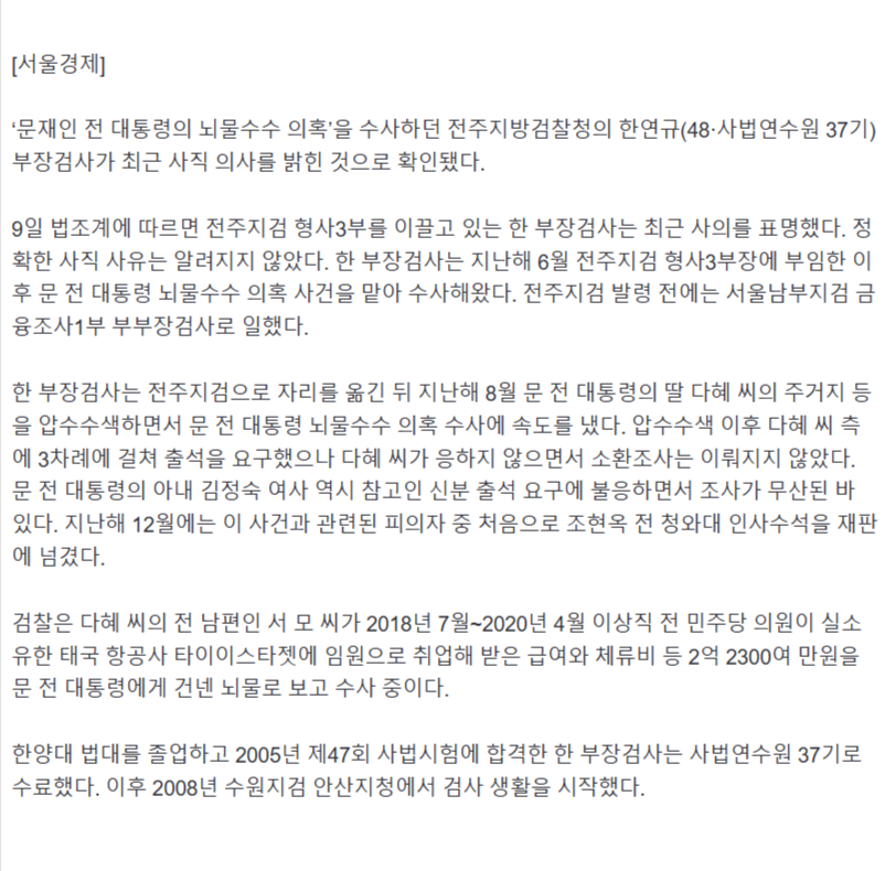 문재인 뇌물 수사하던 부장검사 사의 전주지검에서 수사해선가보다...